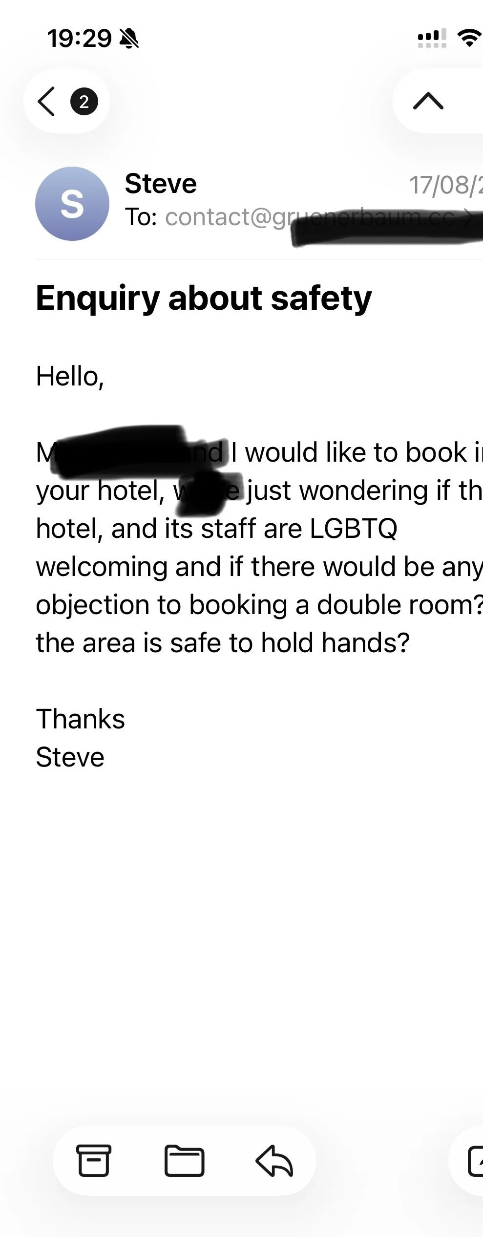 Email (or Whatsapp) is only ever the starting point for me. I do send that first, friendly message asking whether they are LGBTQ-friendly and whether a double bed is standard, and I do pay attention to the tone of the reply.